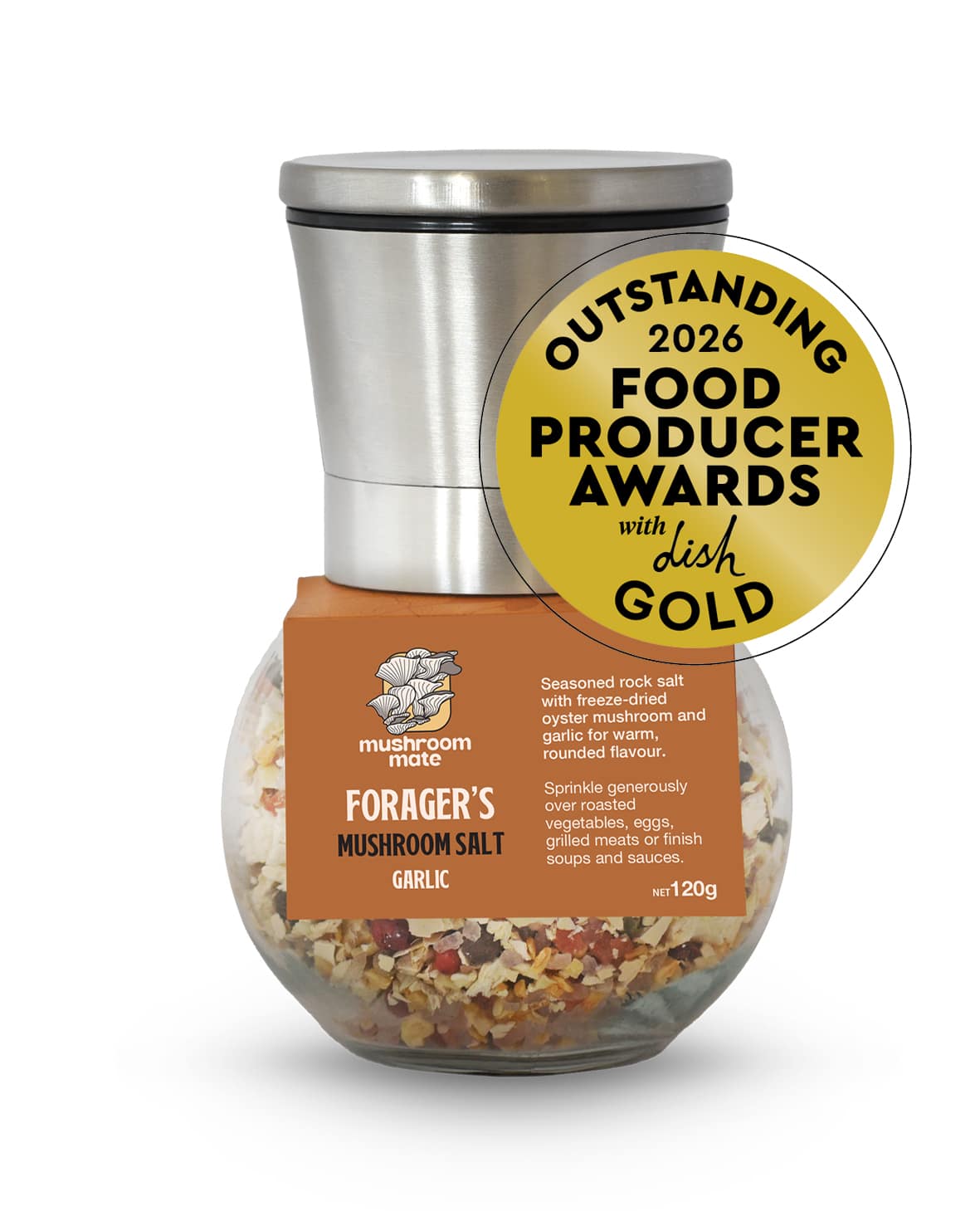 Seasoned rock salt with freeze-dried oyster mushroom and garlic for warm, rounded flavour.