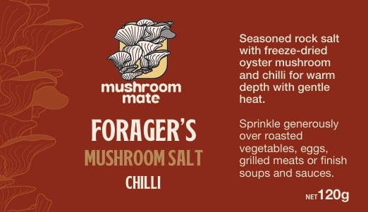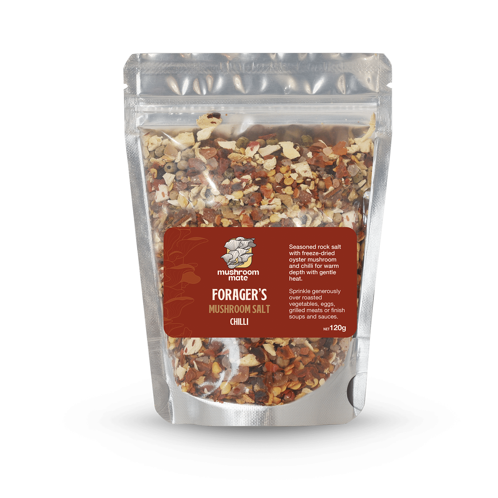 Seasoned rock salt with freeze-dried oyster mushroom and chilli for warm depth with gentle heat.
