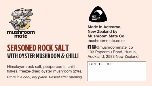 Himalayan salt, with distinctive pink hue and abundant minerals, a spicy mix of white, black, green, and red peppercorns to kick your taste buds into high gear, chilli for warm depth with gentle heat and our home-grown oyster mushrooms, freeze-dried in New Zealand, preserved up to 94% of it’s original fresh goodness.