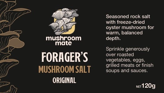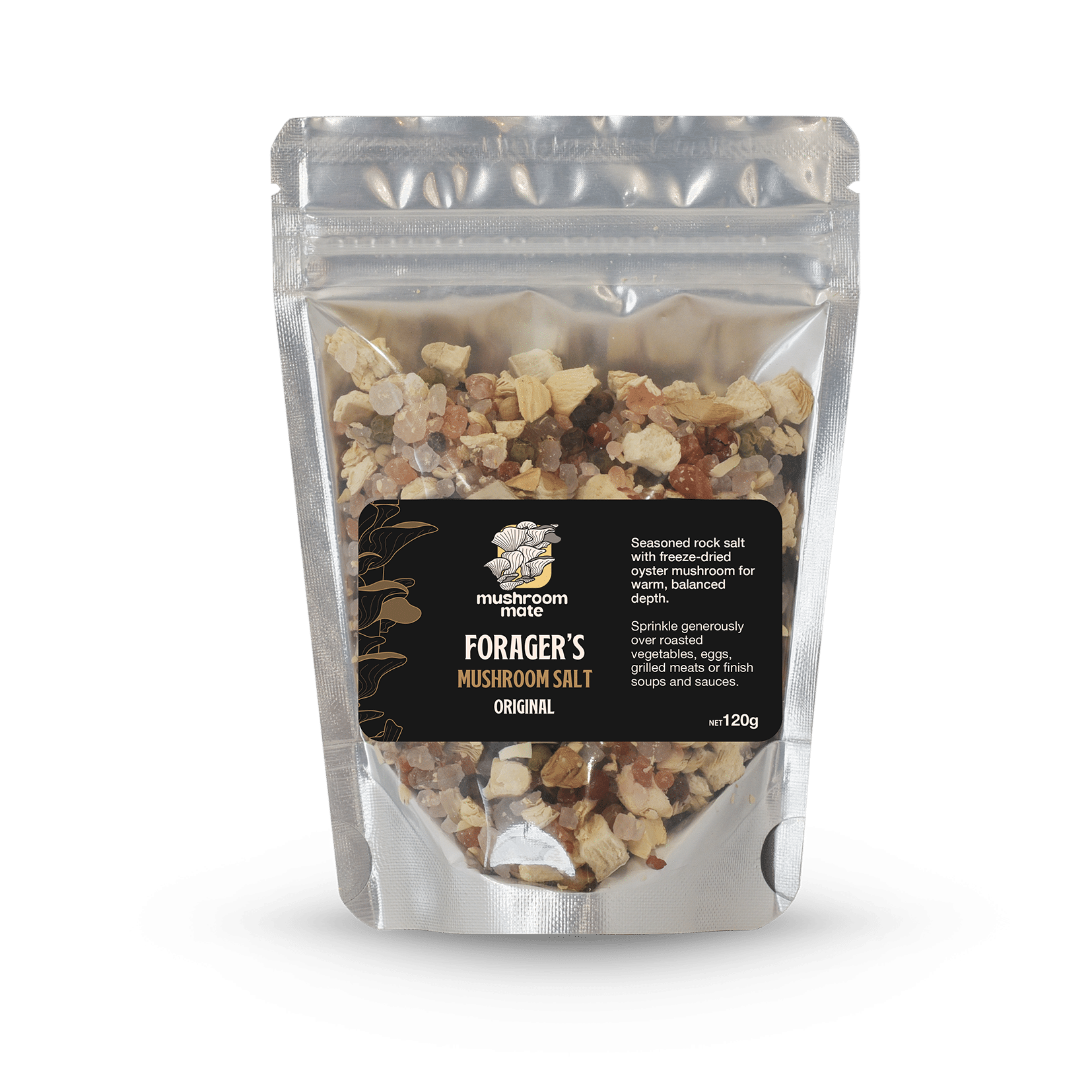 Seasoned rock salt with freeze-dried oyster mushroom for warm, balanced depth.