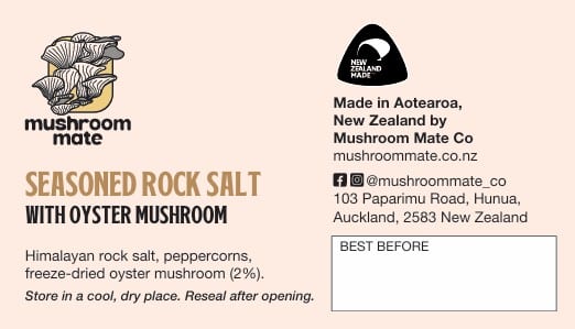 Himalayan salt, with distinctive pink hue and abundant minerals, a spicy mix of white, black, green, and red peppercorns to kick your taste buds into high gear and our home-grown oyster mushrooms, freeze-dried in New Zealand, preserved up to 94% of it’s original fresh goodness.